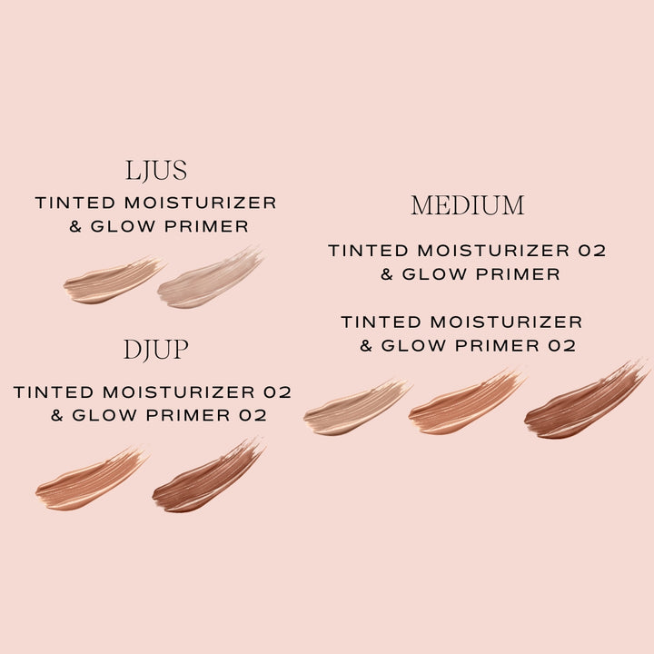 Our products are made to mix & match! From a range from fair to deep, you can mix and match Glow Primer 01 & 02 and Tinted Moisturizer 01 & 02 with each other. Follow the pictures guidelines.