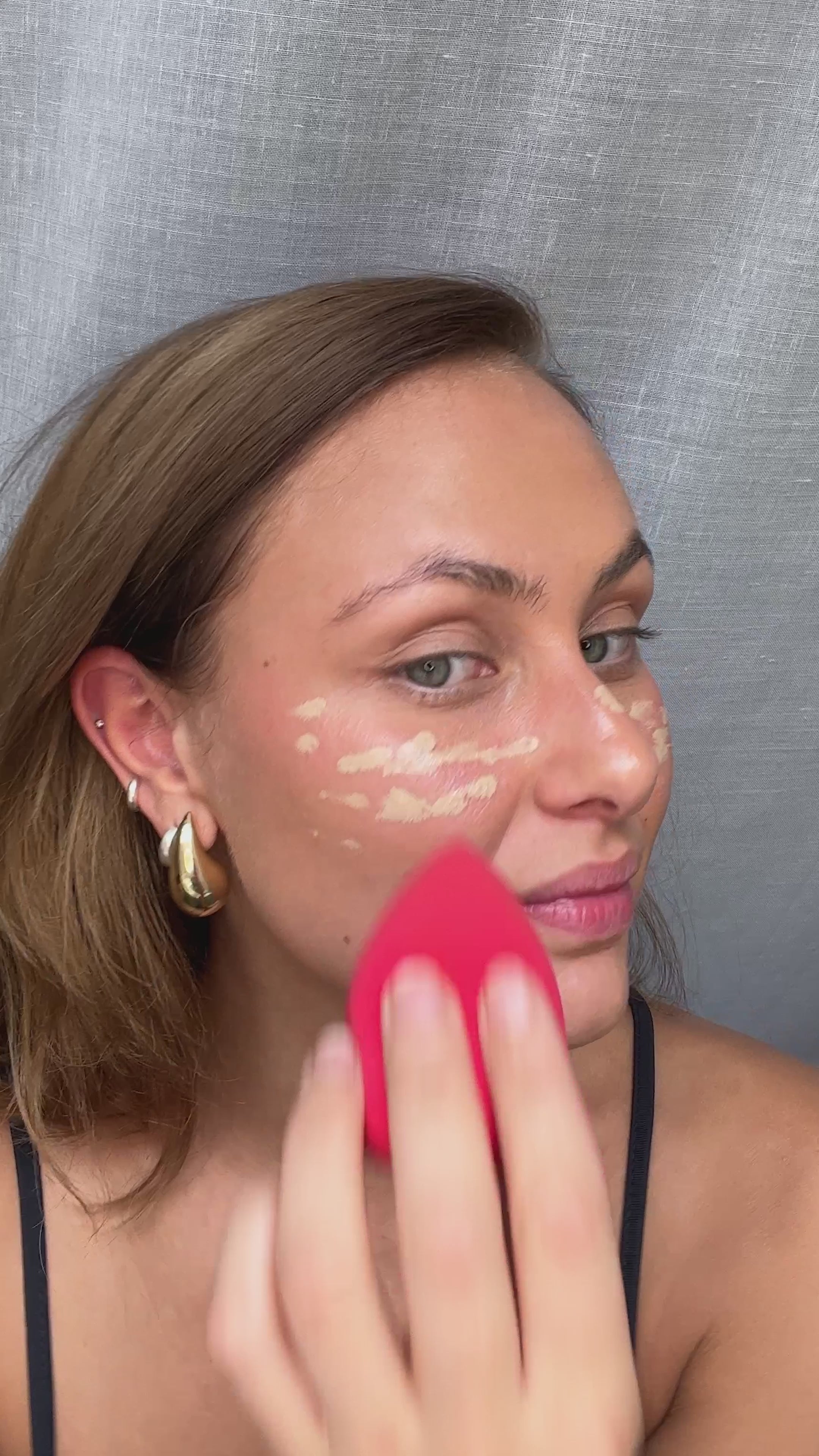 Blöt svampen lätt och krama ur överflödigt vatten så att den blir fuktig men inte blöt. Applicera concealern och dutta in den med svampen för en jämn, naturlig finish. Använd spetsen för mindre områden som under ögonen och den rundade sidan för större partier. Rengör svampen regelbundet och låt den lufttorka.