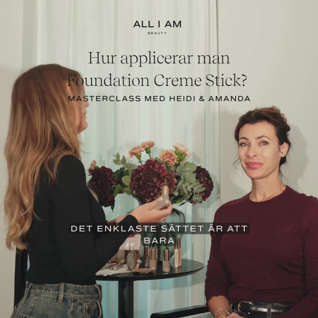 Börja med att rengöra huden och applicera en dagkräm som passar din hudtyp. Låt den sjunka in ordentligt innan du applicerar Foundation Creme Stick. Vill du ha extra lyster kan du lägga till vår Glow Primer innan foundationen. Applicera sedan Foundation Creme Stick och bygg upp täckningen till önskad nivå. Använd concealer där du vill ha lite extra täckning. Avsluta med rouge och bronzer för värme och dimension, och svep ett lätt lager puder på områden du vill matta ner eller där du lätt blir glansig.